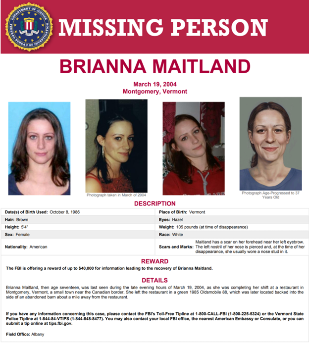 HMI is actively involved in the investigation of the disappearance of Brianna Maitland, missing since 2004, in cooperation with the Vermont State Police.